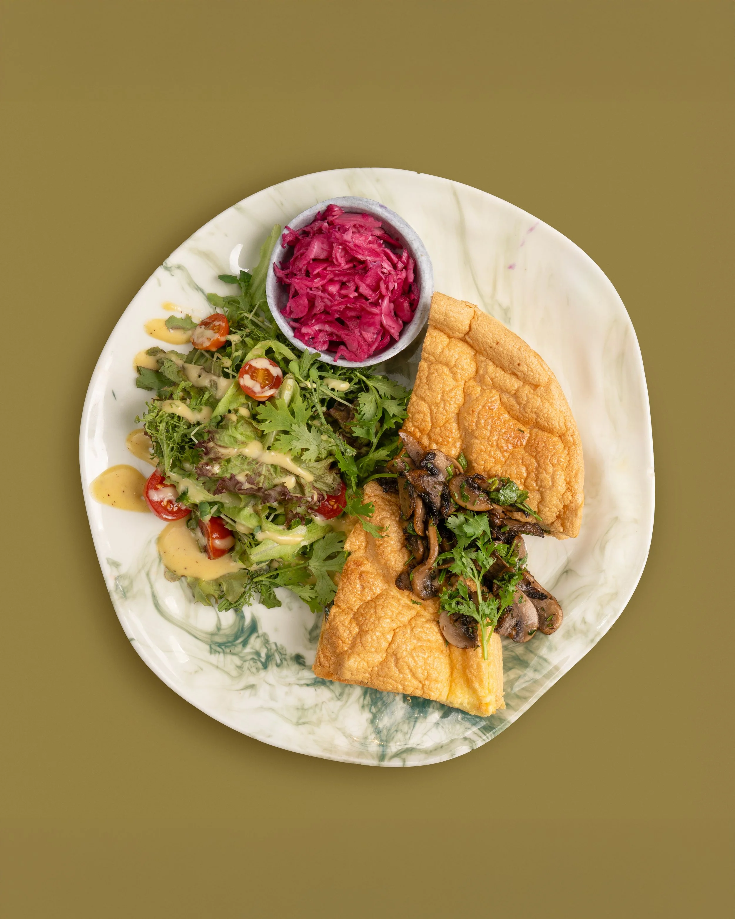 Fluffy omelette, toasted sourdough bread, pickled cabbage and roasted mushrooms.