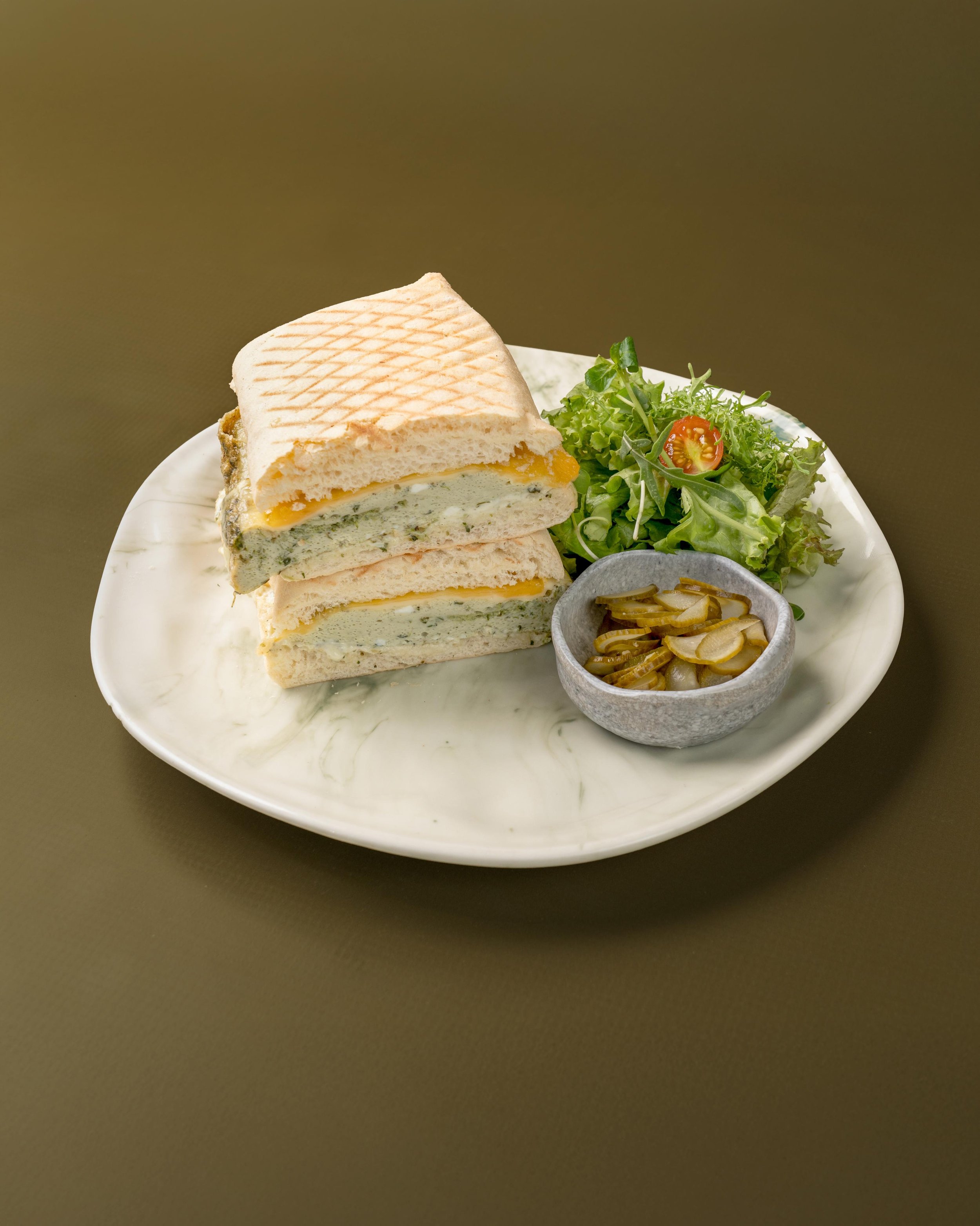 Toasted panini bread, melted Swiss and cheddar cheese, eggs pesto sauce, side salad and pickled cucumber.