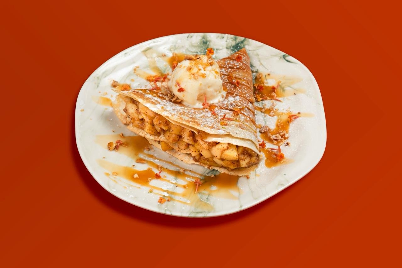 Homemade crepe filled with a warm, sweet mixture of sautéed apples, cinnamon and vanilla ice cream on top.