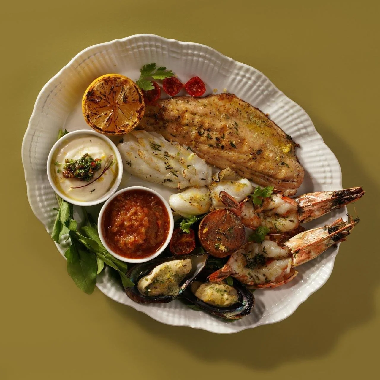 Grilled marinated seafood, shrimp, calamari, fish fillet & mussels, butter baby potatoes & Rocca salad & dip.