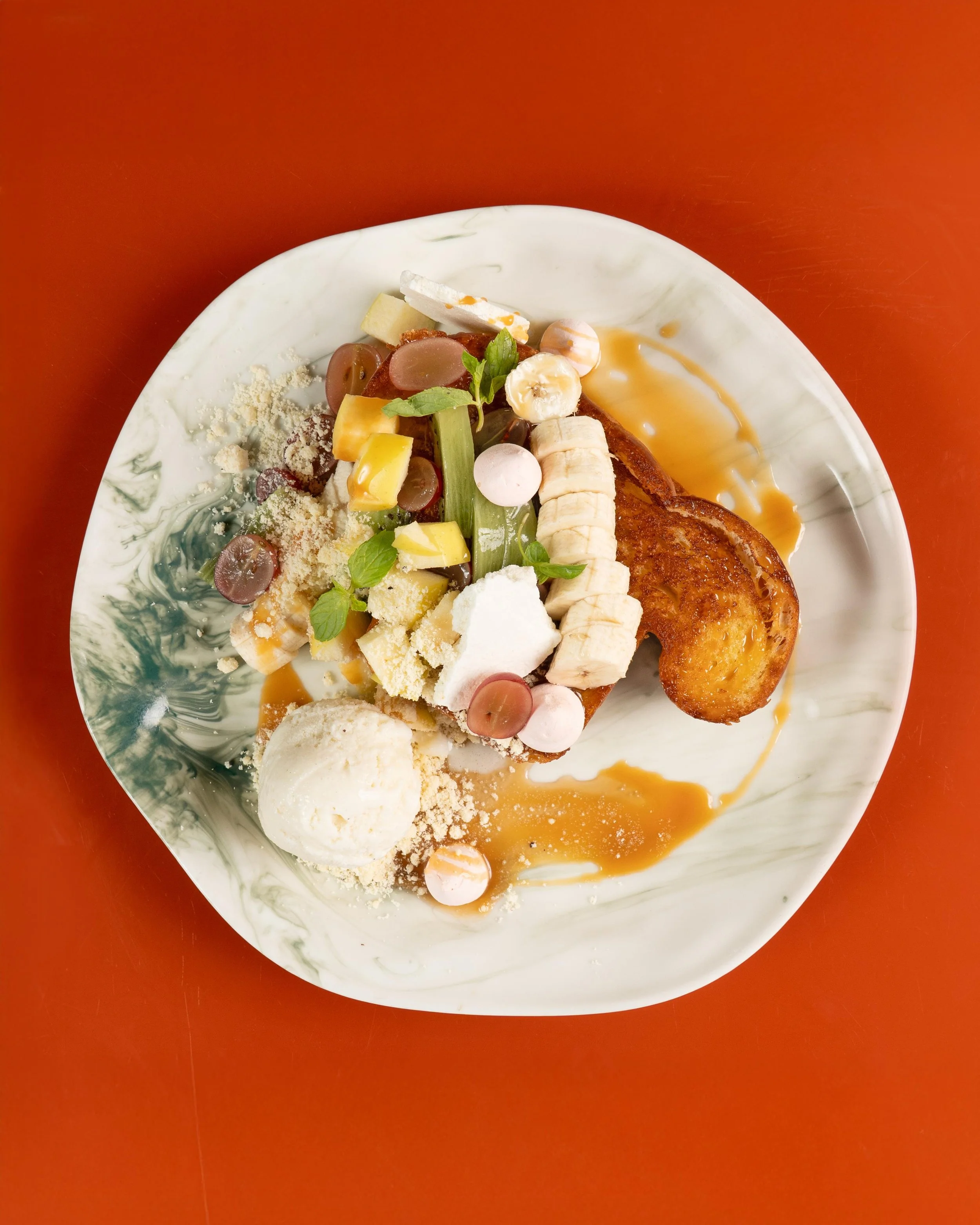 Cinnamon butter toasted, season fruit, and Carmel sauce,syrup
