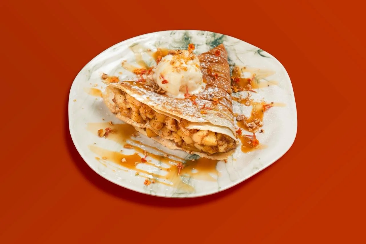 Homemade crepe filled with a warm, sweet mixture of sautéed apples, cinnamon and vanilla ice cream on top.